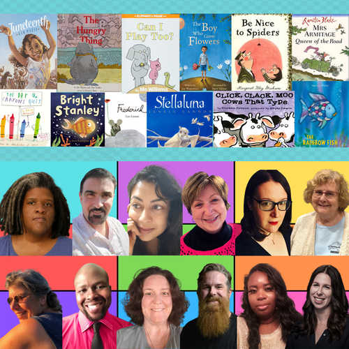 June books include "Juneteenth for Mazie" by Floyd Cooper, "Can I Play Too?" by Mo Willems, "Click, Clack, Moo" by Doreen Cronin, "The Boy Who Grew Flowers" by Jennifer Wojtowicz, and many others, read by Ann-Marie, Brian, Abha, Cathy, Sam, Maureen, Celeste, Richard, Liz, Casey, Marie, and Stacey.